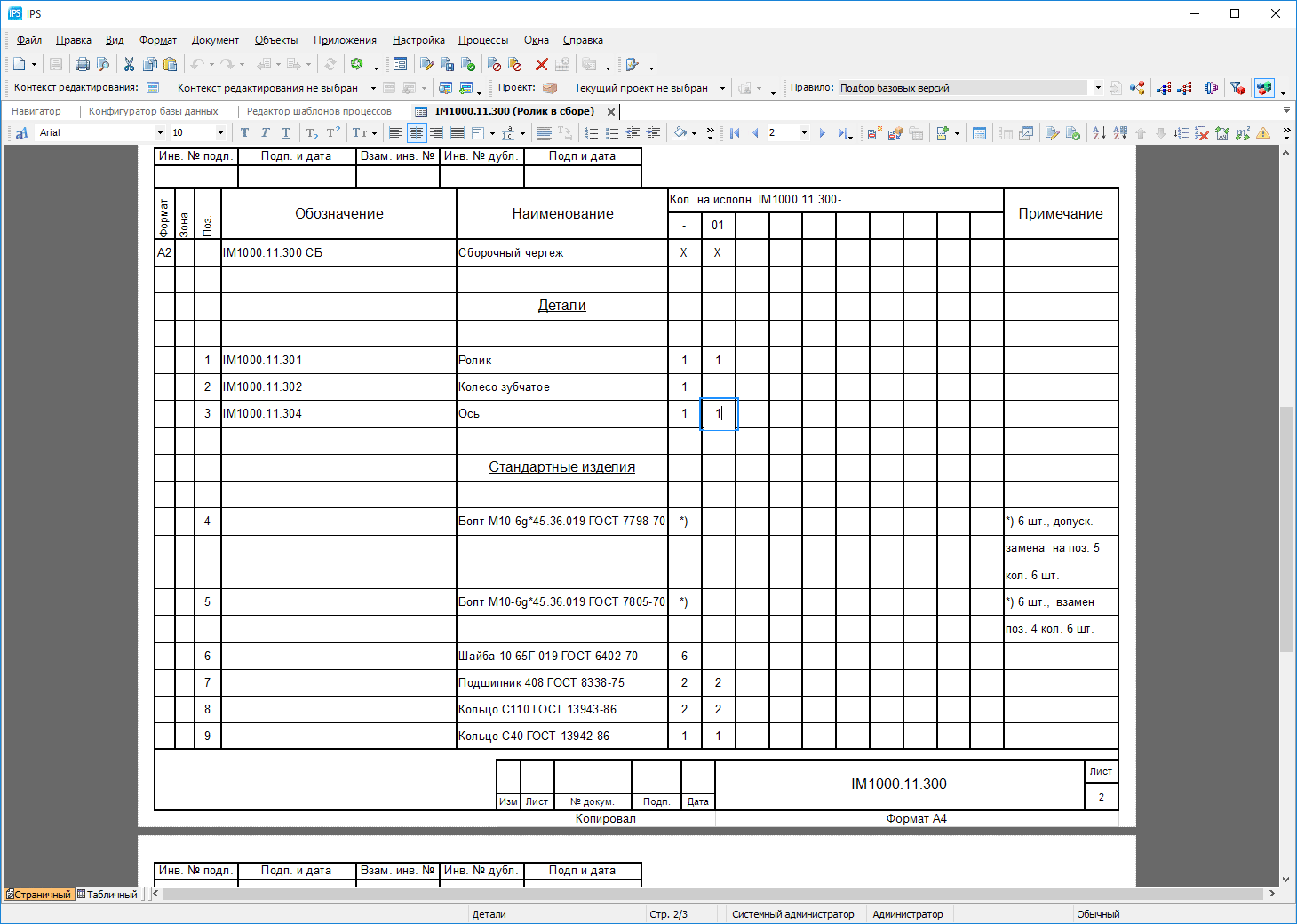 Разработчики IPS не стали надеяться на сторонние офисные пакеты или средства генерации отчётов, а создали собственный редактор структурированных текстовых документов, использующий для хранения данных формат XML. Такое решение позволило унифицировать создание, хранение и обработку любой текстовой конструкторско-технологической документации и реализовать в IPS целый ряд уникальных редакторов, аналогов которым нет ни в одной другой PLM-системе. Например, в комплект поставки IPS входит редактор состава изделий в виде конструкторской спецификации, включая групповые форм А, Б и В. При этом редактирование спецификации может производиться как в обычной табличной форме, так и в том же виде, в котором она будет выведена на печать. Конструктору также доступно множество функций по оформлению спецификации - автоматическая и ручная сортировка, пропуск строк и простановка позиций, оформление допустимых замен и подборных элементов, вставка примечаний, частей, спецсимволов и формул, связь с системами НСИ и многое другое.