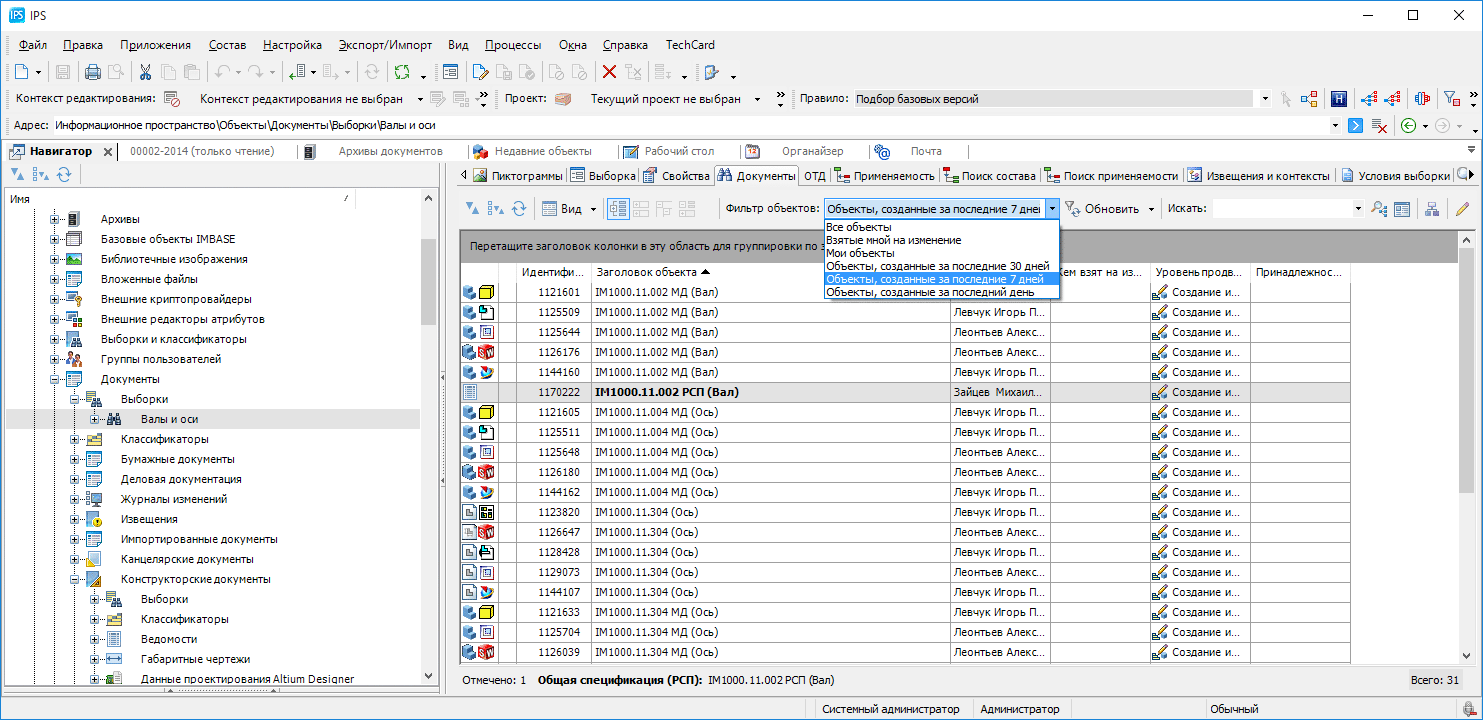 Помимо выборок, классификаторов и рабочего стола, которые в том или ином виде встречаются во всех отечественных PLM, разработчики IPS предложили целый ряд технических решений, значительно ускоряющих поиск информации в системе. Например, в окне "Недавние объекты" автоматически ведётся список объектов, с которыми пользователь работал последнее время - своего рода рабочий стол, который не нужно пополнять и чистить вручную. А с помощью контекстных выборок можно искать информацию, используя свойства выбранного в системе объекта. Условия таких выборок могут содержать не константы, а ссылки на атрибуты объекта, относительно которого идет поиск информации. Например, можно быстро найти все детали, сделанные из такого же материала, не указывая в условиях поиска сам материал.