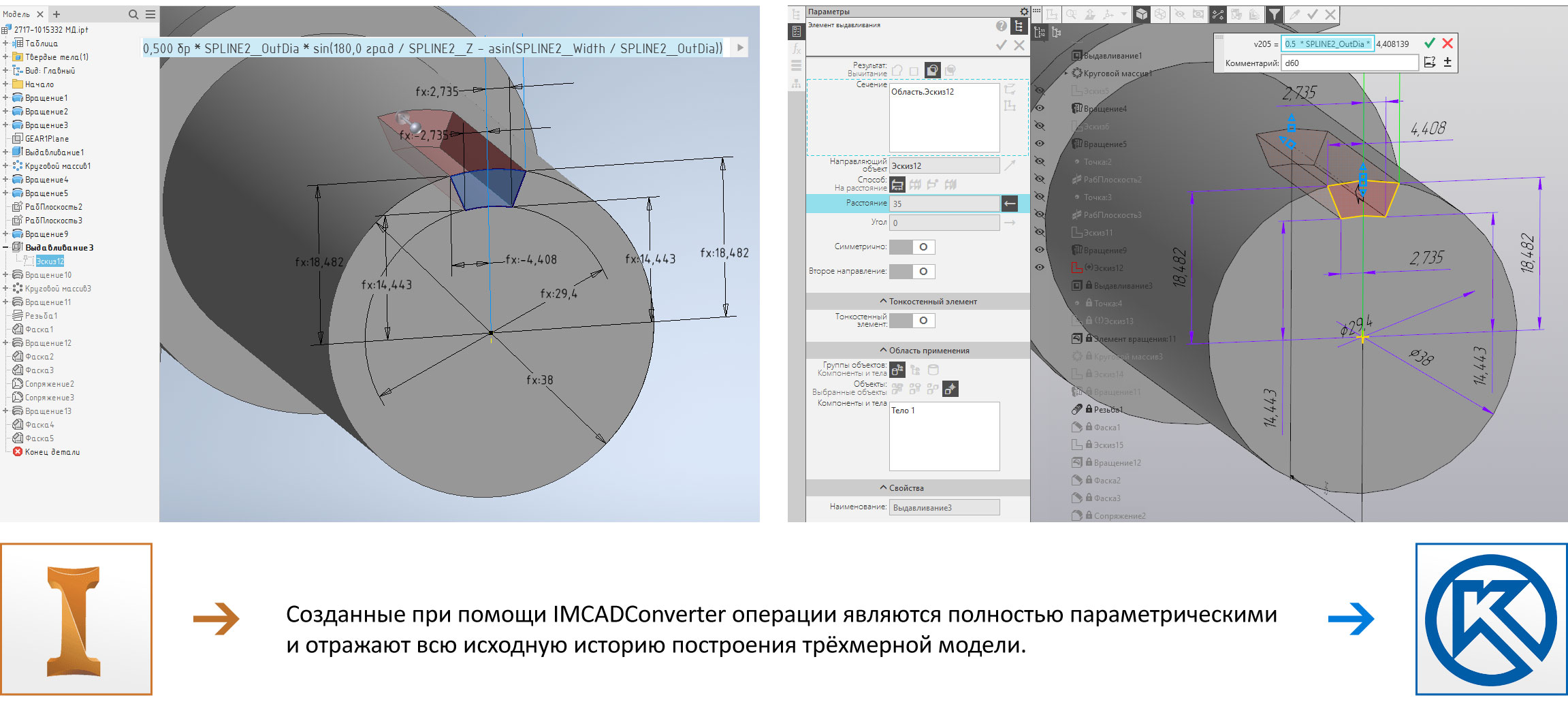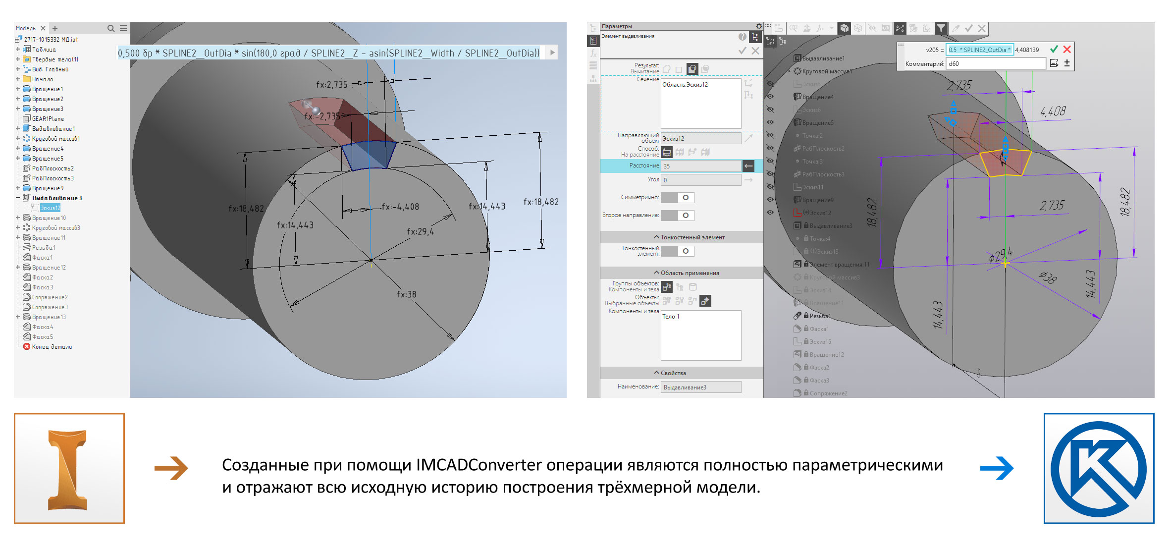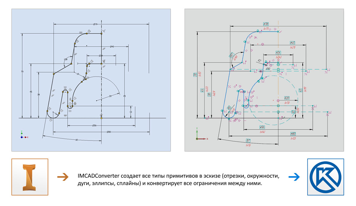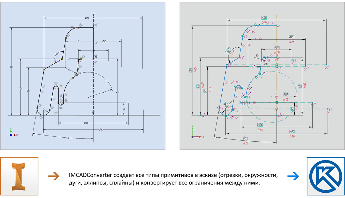 IMCADConverter умеет создавать все типы примитивов (отрезки, окружности, дуги, эллипсы, сплайны), конвертирует все ограничения между ними (параллельность, перпендикулярность, касательность, симметричность и т.д.). Также IMCADConverter обрабатывает все типы размеров между примитивами (линейные, диаметральные, угловые и т.д.). Реализована полноценная работа с математическими выражениями и формулами. Кроме этого поддерживается механизм проецирования внешних геометрических объектов в эскиз.