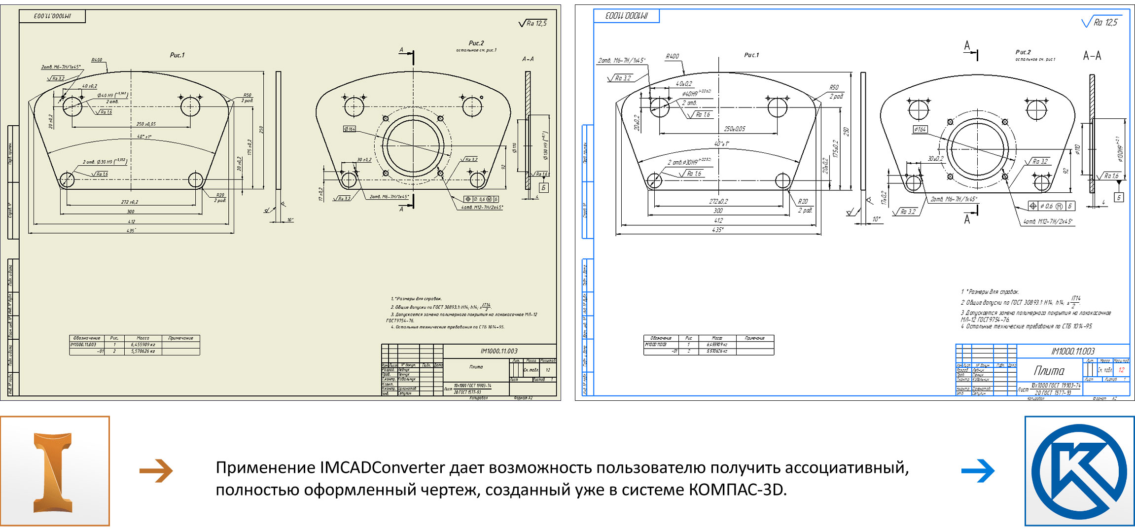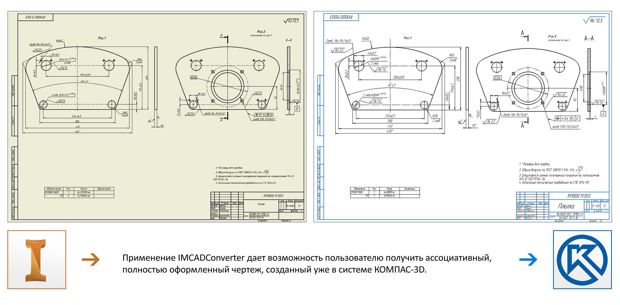Процесс конвертации чертежей в IMCADConverter: из исходной CAD-системы получаем сведения о всех чертежных видах, какие 3D-модели и в каком ракурсе на них отображены, и где эти виды расположены на листах. Затем в системе КОМПАС-3Dсоздается новый чертеж и IMCADConverter воссоздает на нем точно такие же виды. Причем в КОМПАС-3D эти виды строятся по ранее сконвертированным моделям деталей и сборок, поэтому являются полностью ассоциативными. Все элементы оформления, включая размеры и технические требования, также переносятся на новый чертеж. В результате конвертации пользователь получает ассоциативный, полностью оформленный чертеж, созданный уже в системе КОМПАС-3D.