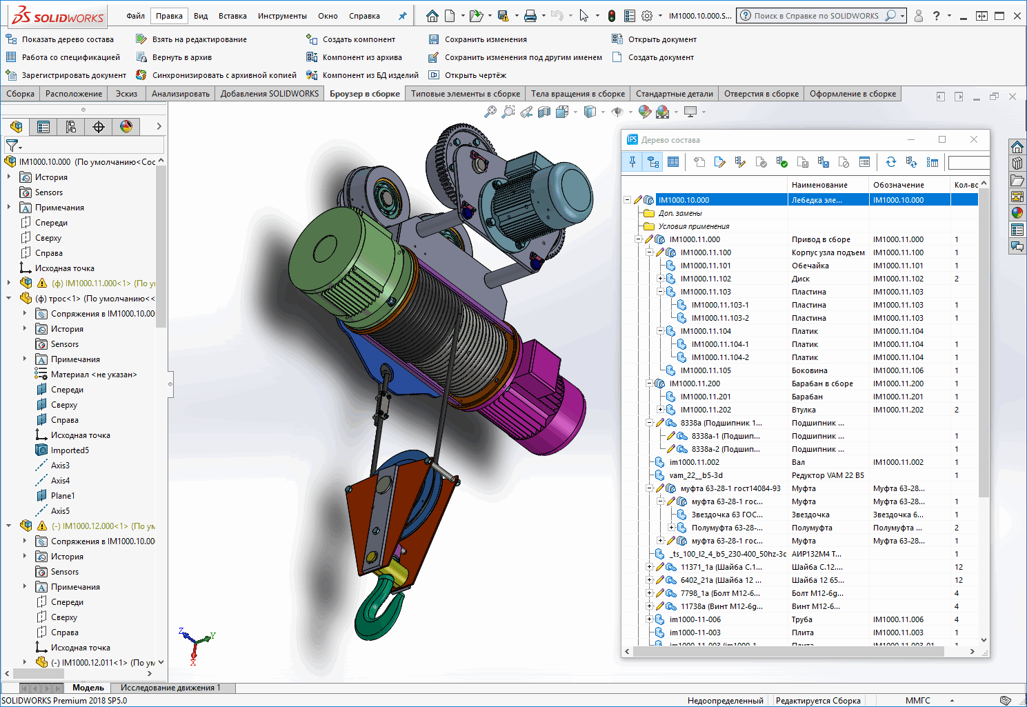 Встроенный редактор состава изделий в виде конструкторской спецификации, включая групповые форм А, Б и В. При этом редактирование спецификации может производиться в том же виде, в котором она будет выведена на печать.
