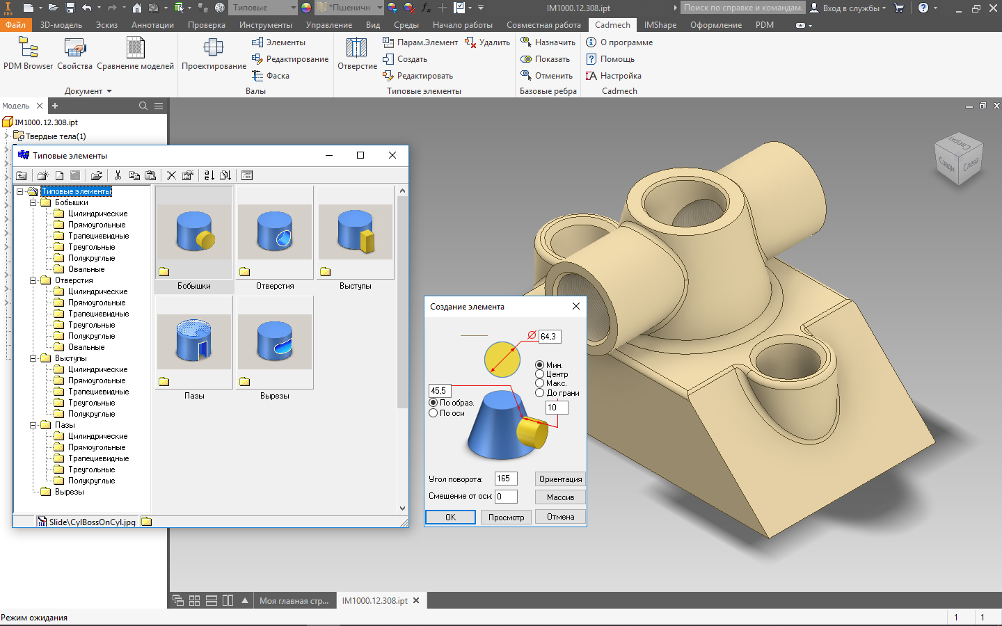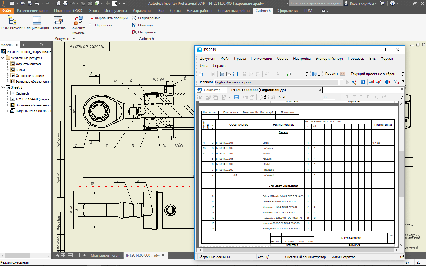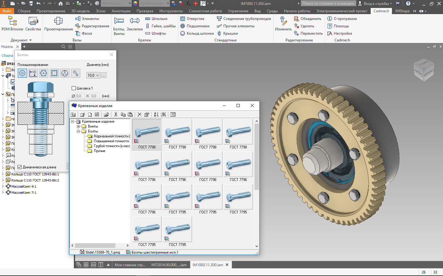 Всю информацию, необходимую для отрисовки стандартных деталей, система получает из единой конструкторско-технологической базы данных IPS IMBase (более 3000 ГОСТов), входящей в состав Cadmech Inventor. В библиотеке стандартных и прочих изделий информация о типах элементов, типоразмерах, исполнениях представлена в виде иерархической структуры для удобства выбора и применения. Пользователям предлагается широкий набор болтов, винтов, подшипников (более 25 типов), гаек, шайб, шпилек, штифтов, который может расширяться самим пользователем без привлечения программистов.