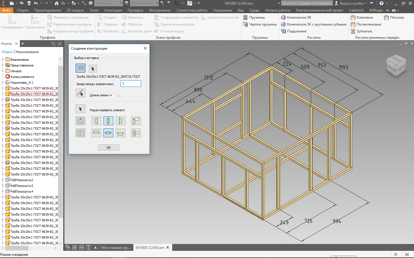 В базу данных включено большое количество профилей из черных и цветных металлов различных типов сечений. Cadmech Inventor позволяет генерировать как непосредственно конструкции из профилей, так и производить обвязку уже существующей конструкции выбранным типом профиля. При этом конструктору на выбор предлагаются допустимые варианты разделки профилей с автоматическим наложением всех сборочных зависимостей.