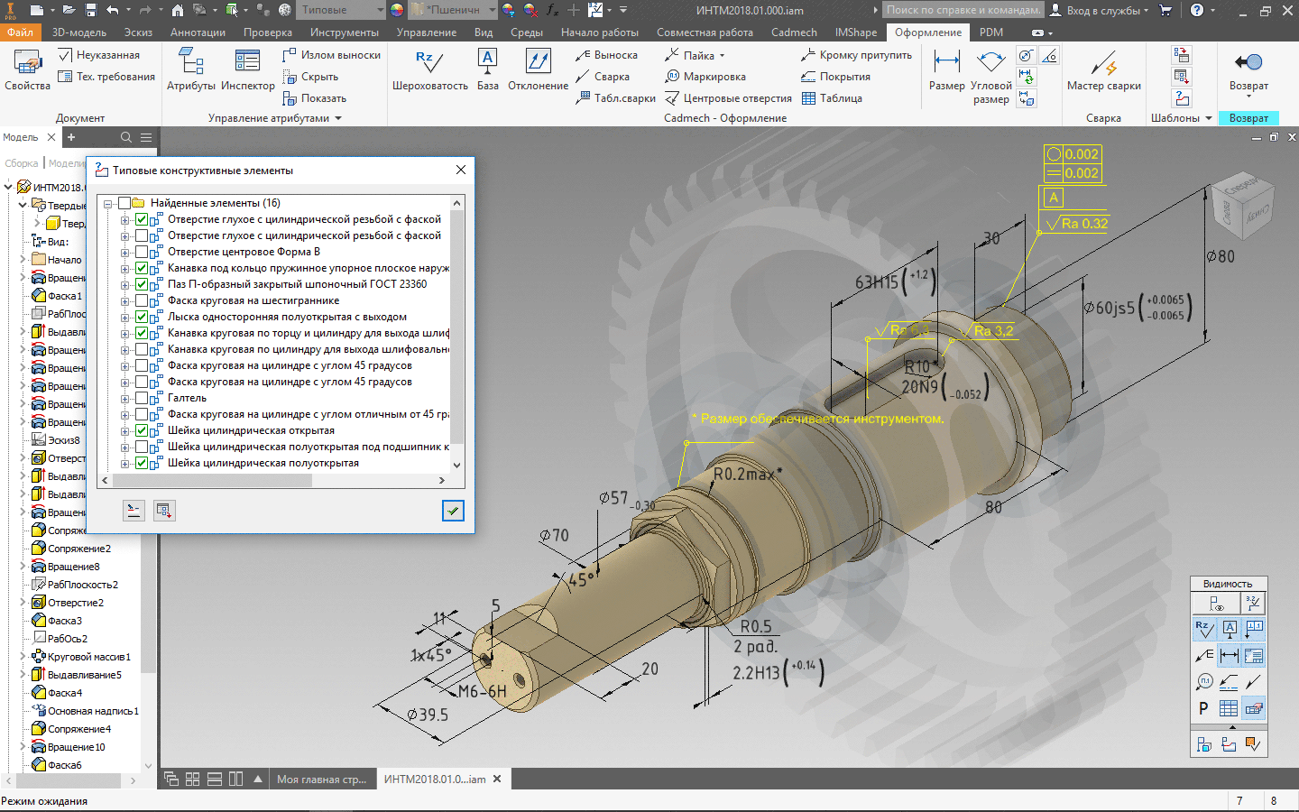 Система позволяет конструктору использовать как предоставляемые в составе Cadmech Inventor варианты оформления для стандартизованных элементов (канавки под выходы шлифовальных кругов и резьбы, канавки под уплотнительные и запорные кольца, шейки валов под подшипники, манжетные уплотнения, упорные и запорные кольца, отверстия под крепежные элементы и множество других элементов), так и разрабатывать и применять шаблоны оформление для собственных элементов, наиболее часто встречающихся в разрабатываемых на предприятии конструкциях.