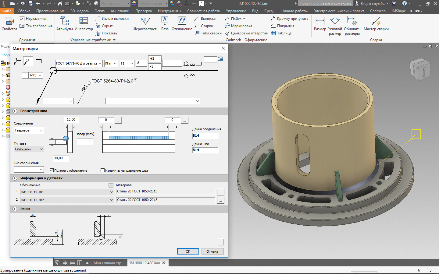 С целью автоматизации процесса нанесения обозначений сварных швов на 3D-моделях для Cadmech Inventor разработан модуль "Мастер сварки". Он позволяет, по указанным ребрам или поверхностям для сваривания, распознавать тип и параметры наносимого сварного шва.