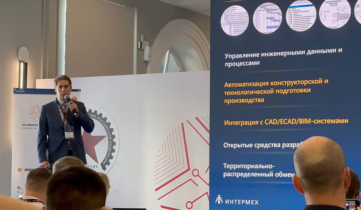 Актуальные вопросы цифровой трансформации промышленности обсуждались в формате тематических секций. Представители ИНТЕРМЕХ приняли участие в работе Секции 2 «Управление полным жизненным циклом оборонной продукции». Александр Зимницкий, заместитель руководителя отдела продаж компании ИНТЕРМЕХ, представил успешные кейсы внедрения линейки продуктов ИНТЕРМЕХ на предприятиях ОПК. Многофункциональные решения компании вызвали живой интерес у участников форума.