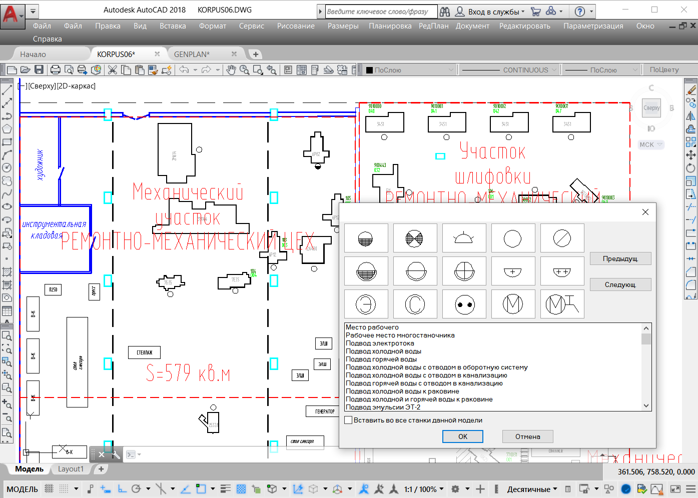 Система LCAD функционирует в среде AutoCAD, и позволяет создать генплан предприятия, из которого визуально можно получить представление о расположении корпусов, цехов и прилегающих к ним проездах, а также легко загрузить планировку выбранного обьекта. Цель чертежа генплана - обеспечить удобный своей наглядностью пользовательский интерфейс входа в любое производственное здание (сооружение), вычерченное и обозначенное штриховкой на генплане и зарегистрированное в справочнике сооружений системы LCAD.