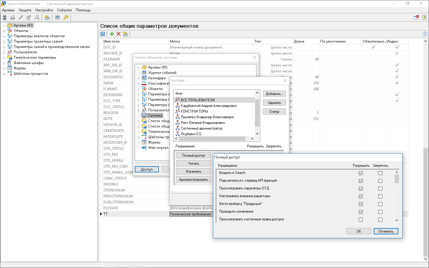 Search обеспечивает гибкое управление и контроль прав доступа к различным объектам системы (архивам, документам, изделиям, классификаторам, процессам и т.п.)
