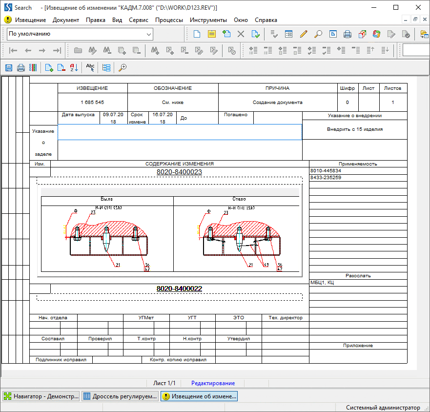 Система обеспечивает проведение изменений утвержденных документов с выпуском извещений различных типов (извещения об изменении, предварительные извещения, предложения об изменениях, дополнительные извещения, комплект извещений), их утверждением со сбором необходимых подписей и учетом всех имеющихся версий документов. На основании выпущенных извещений автоматически формируется лист регистрации изменений для каждого документа.