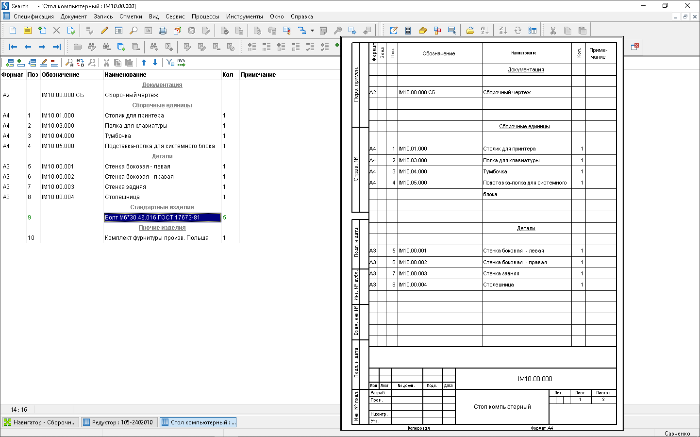В состав системы входит встроенный редактор конструкторских спецификаций. Поддерживаются как обычные (единичные) спецификации, так и групповые спецификации форм А и Б по ГОСТ 2.113, а также спецификации на «парные» изделия (например, левое и правое исполнения), характерные для автомобильной промышленности. Обеспечивается работа с допустимыми заменами в составе изделия в различных режимах – один-на-один, один-на-много, много-на-много и др.